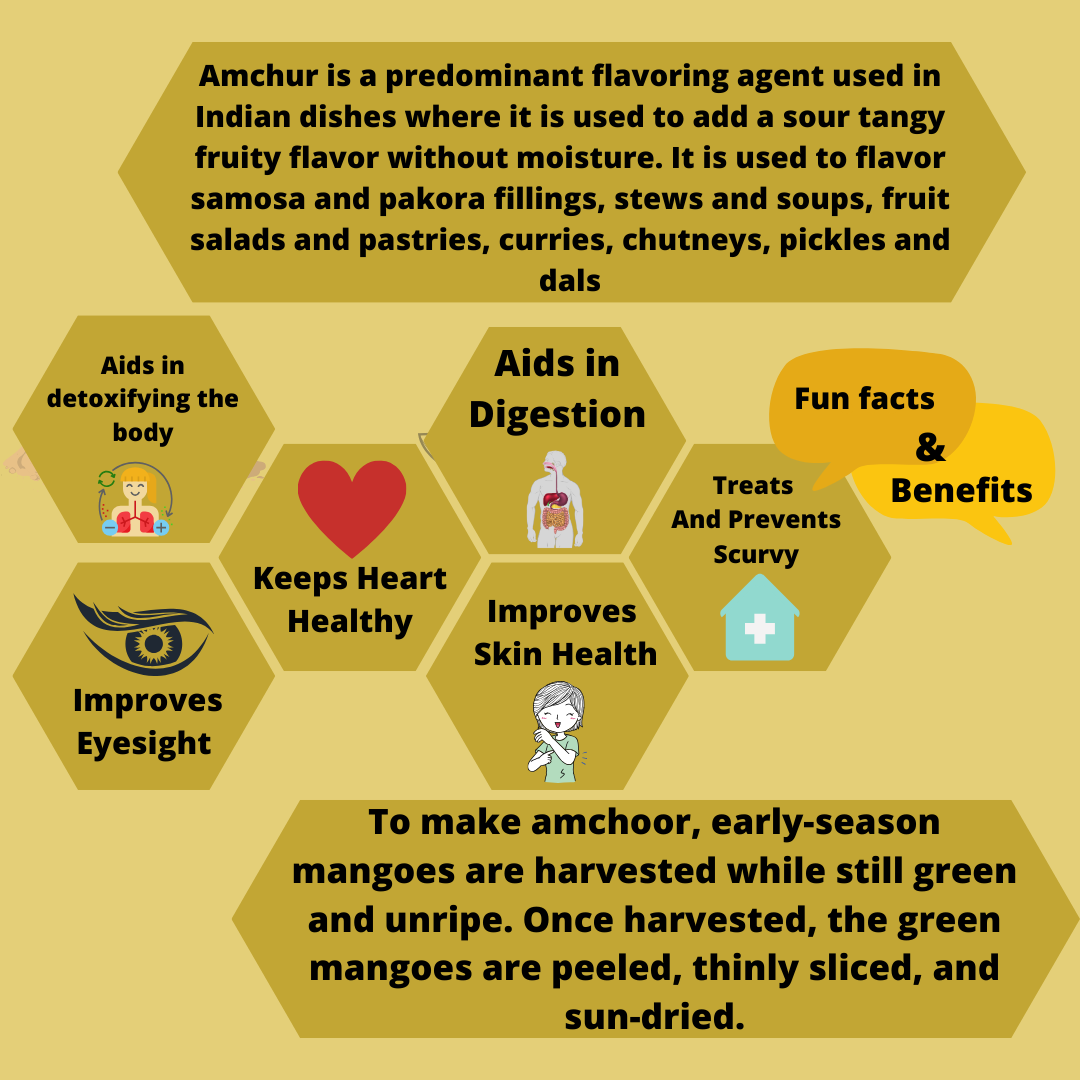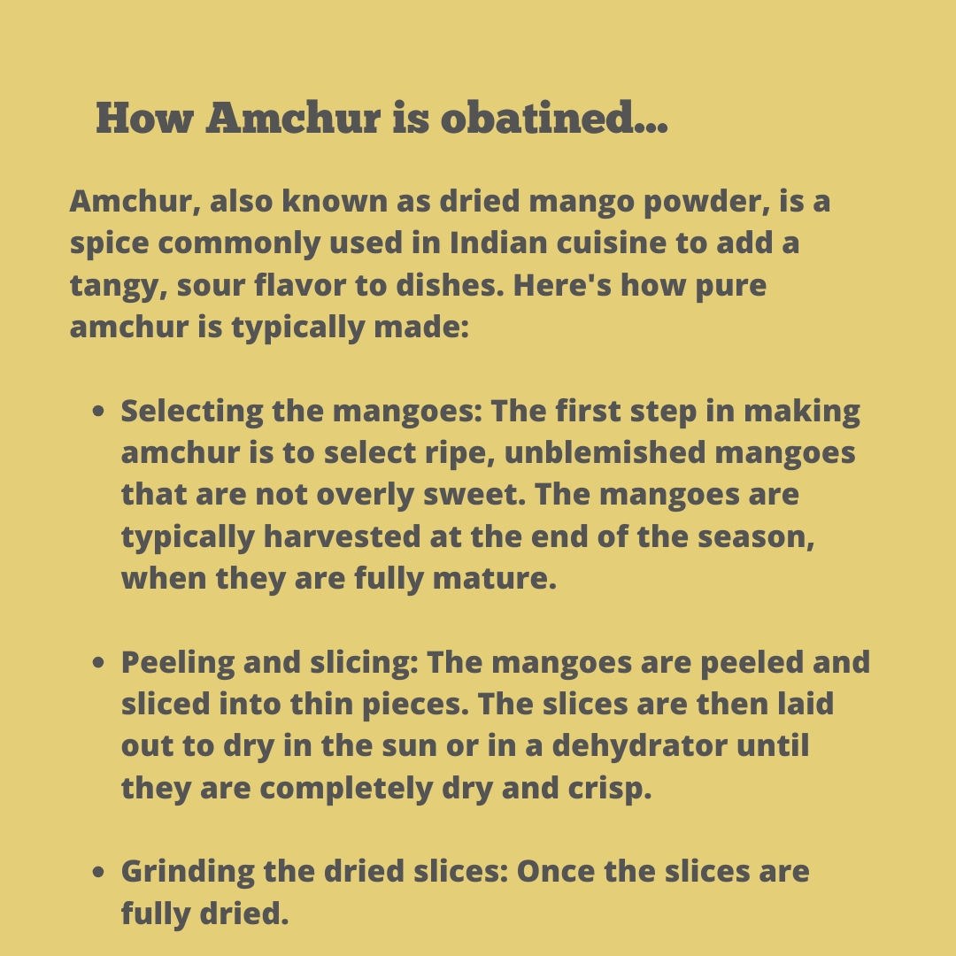 Introducing our freshly ground pure amchur powder, made from hand-selected mangoes. We understand that it can be difficult to find high-quality amchur powder that is pure and free from additives, which is why we take pride in providing our customers with the very best.