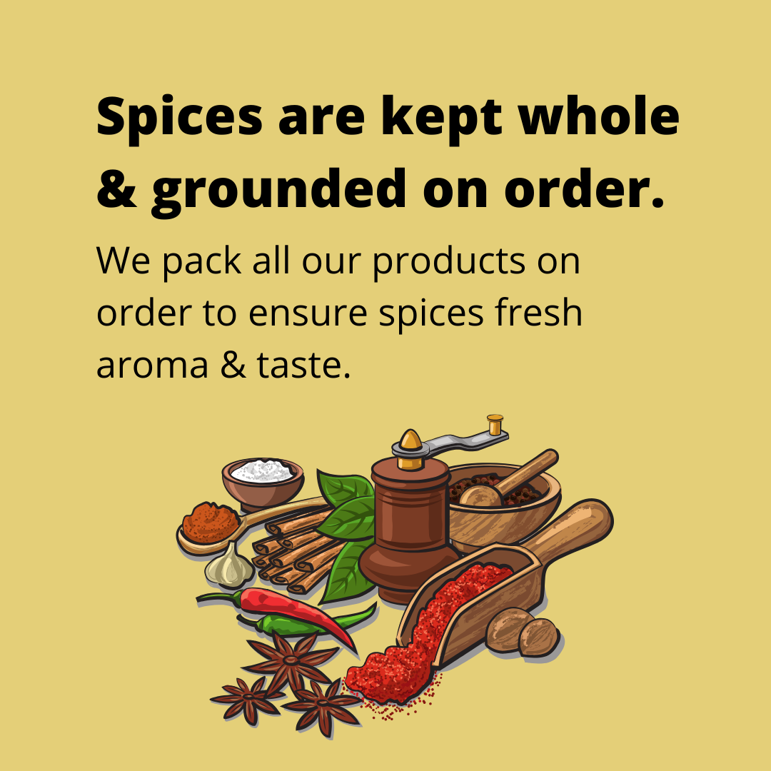 Spices get their intense flavor and aroma from volatile oils locked inside the whole spice. Grinding spices releases these oils, which means that many pre-ground spices-while convenient-have lost a lot of their magic before they reach your kitchen. The fresher the grind, the more potent the spice. We believe in providing freshly ground spices to our customers. Every product is packed after receiving order so that our customer can enjoy fresh aroma & flavor of spices & herbs. Each spice is carefully selected and curated from farms that practice environmental stewardship and empower their local communities.