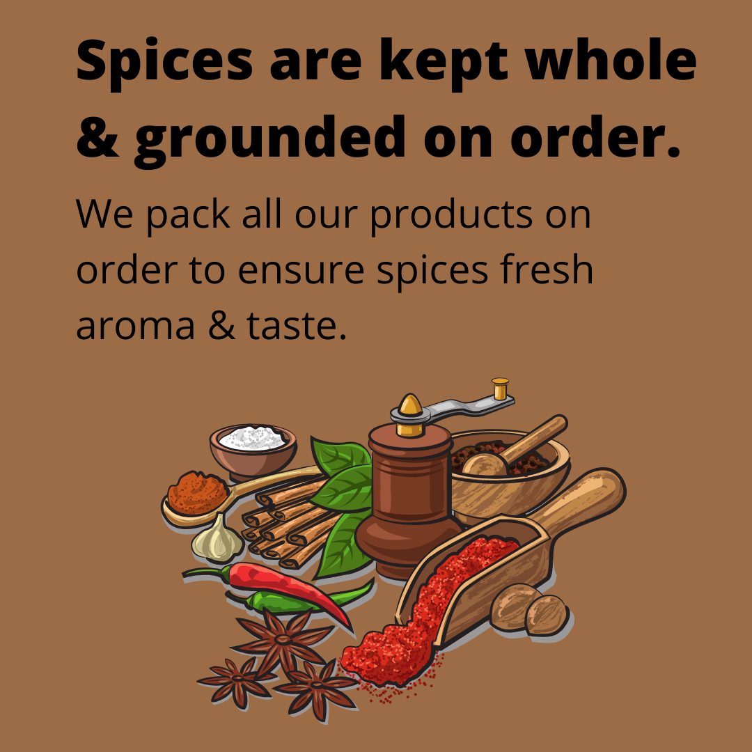 Spices get their intense flavor and aroma from volatile oils locked inside the whole spice. Grinding spices releases these oils, which means that many pre-ground spices-while convenient-have lost a lot of their magic before they reach your kitchen. The fresher the grind, the more potent the spice. We believe in providing freshly ground spices to our customers. Every product is packed after receiving order so that our customer can enjoy fresh aroma & flavor of spices & herbs. Each spice is carefully selected and curated from farms that practice environmental stewardship and empower their local communities.