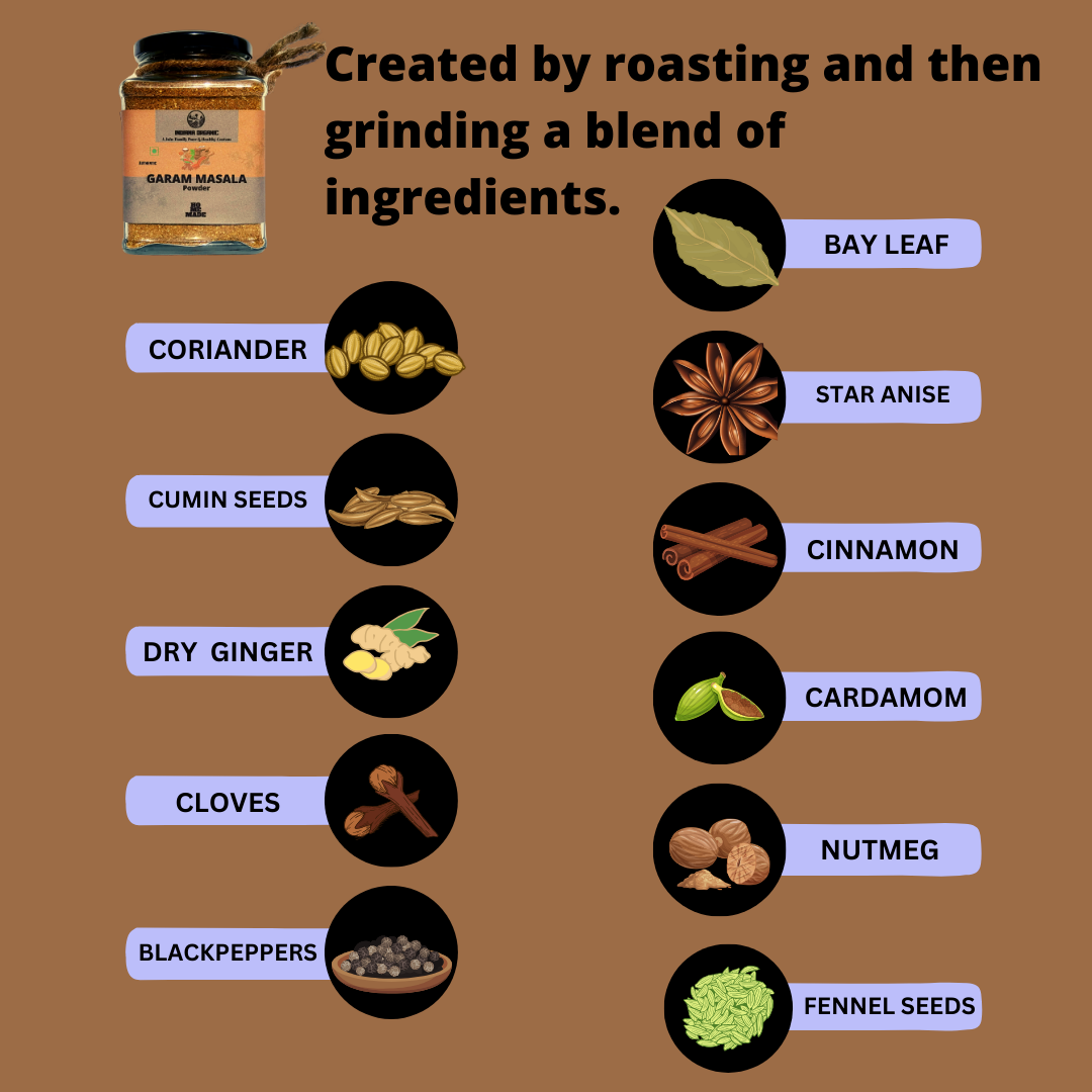 - Ingredients - Cumin seeds, fennel seeds, cinnamon, cardamom, black pepper, cloves, coriander seeds, bay leaf, star anise, nutmeg, ginger powder.