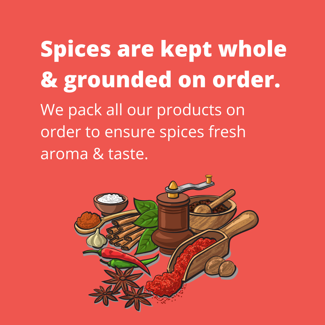 Spices get their intense flavor and aroma from volatile oils locked inside the whole spice. Grinding spices releases these oils, which means that many pre-ground spices-while convenient-have lost a lot of their magic before they reach your kitchen. The fresher the grind, the more potent the spice. We believe in providing freshly ground spices to our customers. Every product is packed after receiving order so that our customer can enjoy fresh aroma & flavor of spices & herbs. Each spice is carefully selected and curated from farms that practice environmental stewardship and empower their local communities.
