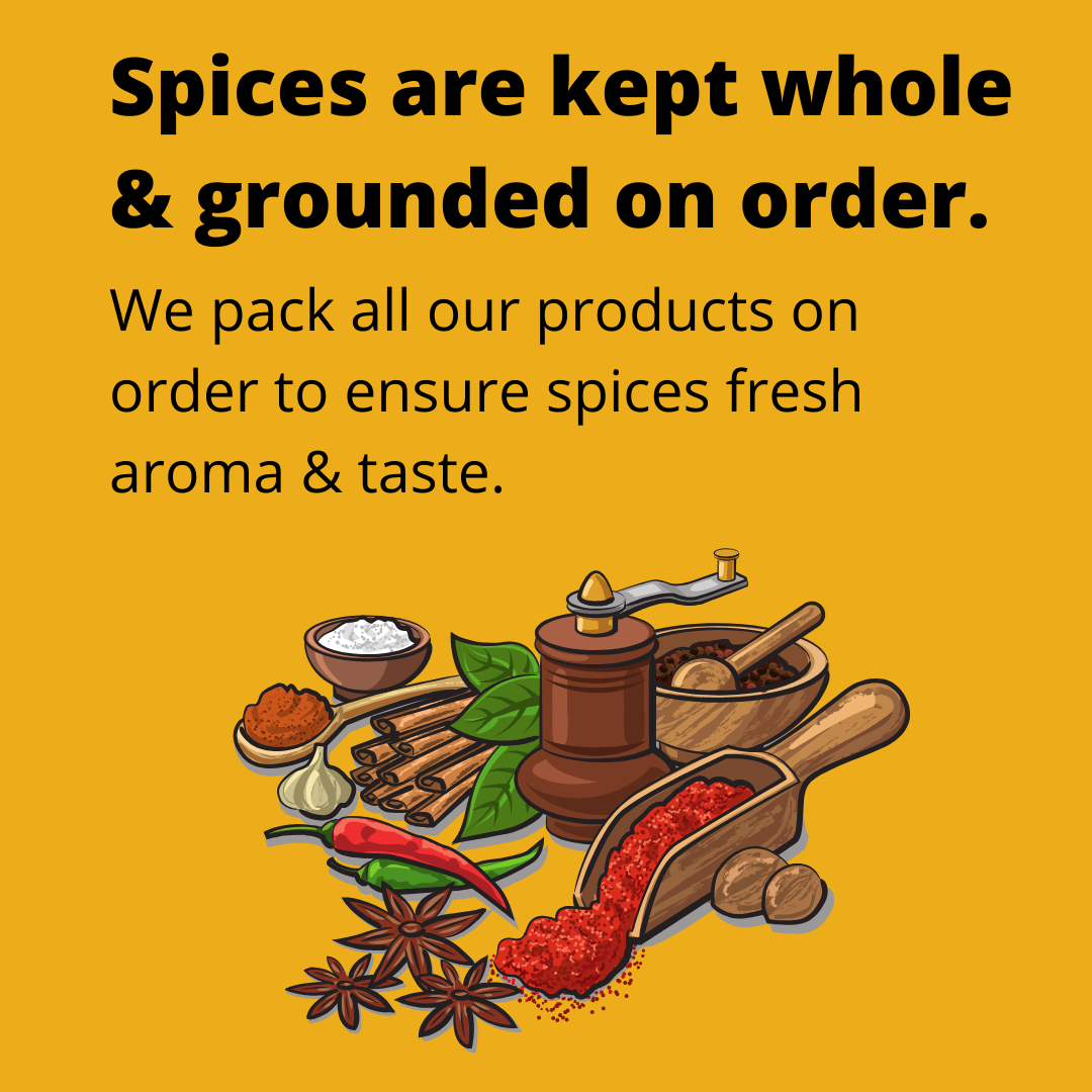 Spices get their intense flavor and aroma from volatile oils locked inside the whole spice. Grinding spices releases these oils, which means that many pre-ground spices-while convenient-have lost a lot of their magic before they reach your kitchen. The fresher the grind, the more potent the spice. We believe in providing freshly ground spices to our customers. Every product is packed after receiving order so that our customer can enjoy fresh aroma & flavor of spices & herbs. Each spice is carefully selected and curated from farms that practice environmental stewardship and empower their local communities.