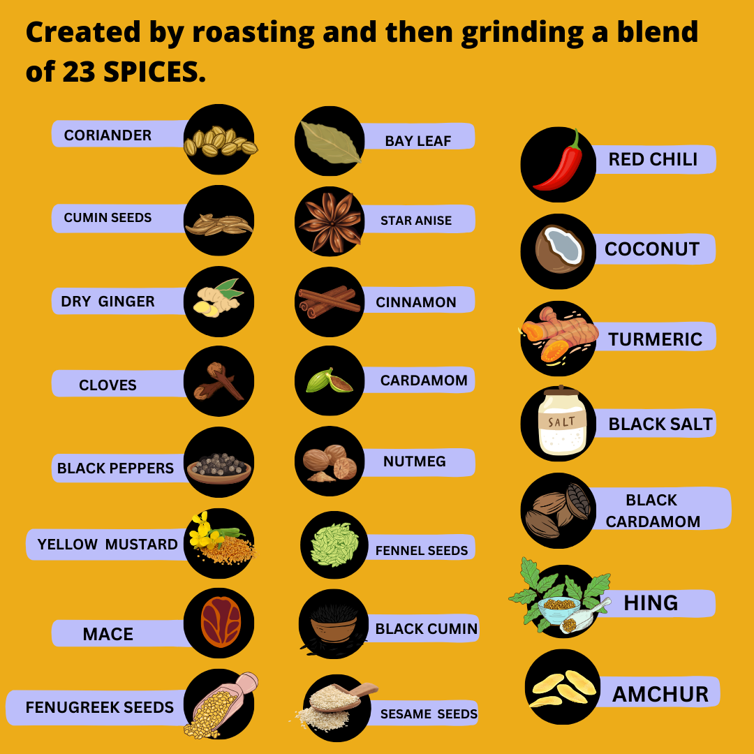 - Ingredients - Red chilli, corainder, clove, black pepper, clove pepper, cinnamon, black cumin, cumin seed, star anise, hing, sesame seed. coconut, turmeric powder, black salt, black cardamom, fennel seed, fenugreek seed, cardamom, bay leaf, curry leaves, mace, ginger powder, yellow mustard.
