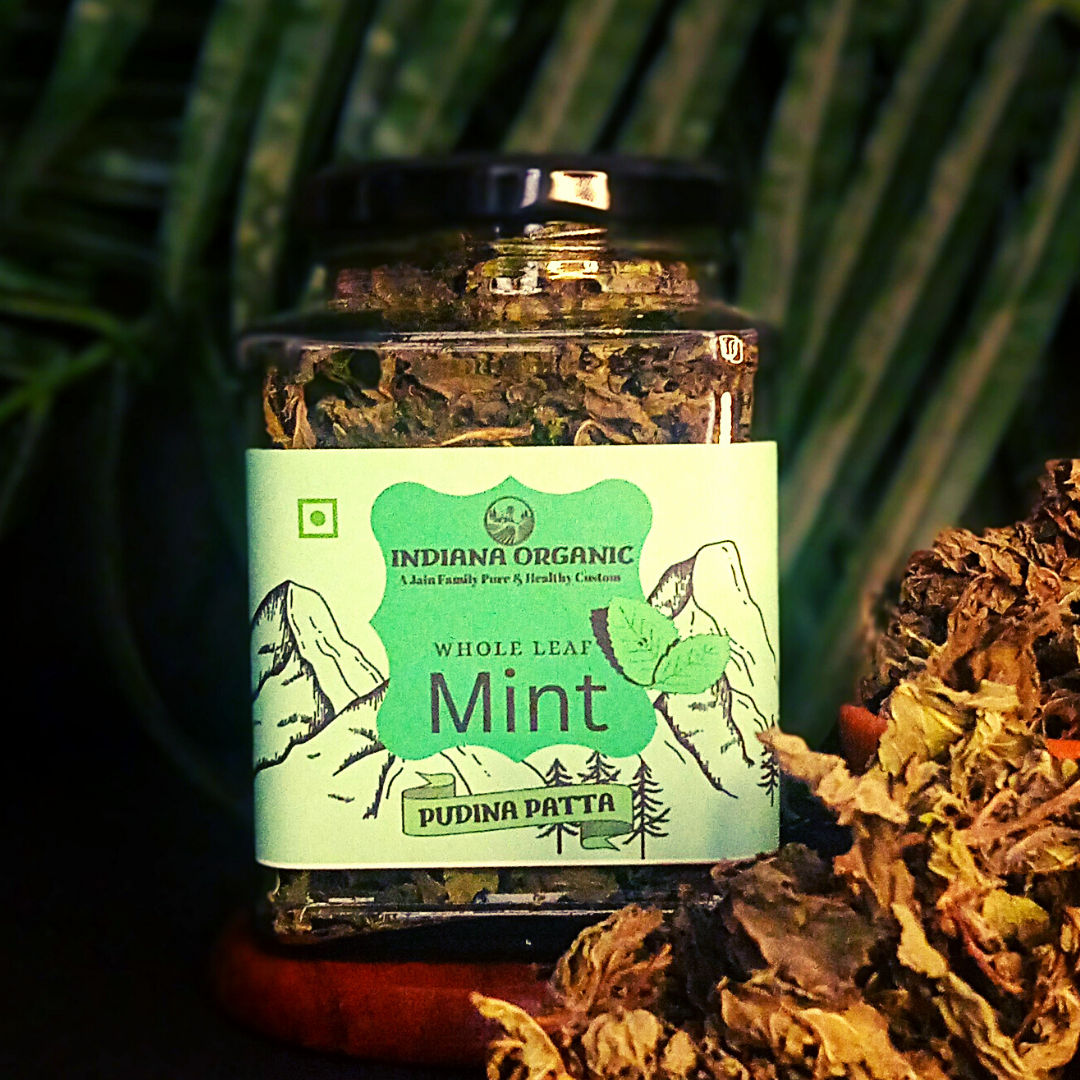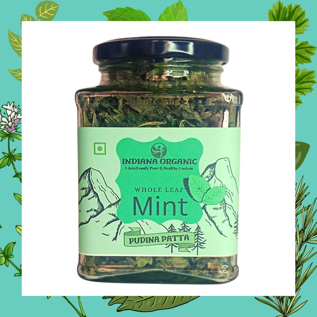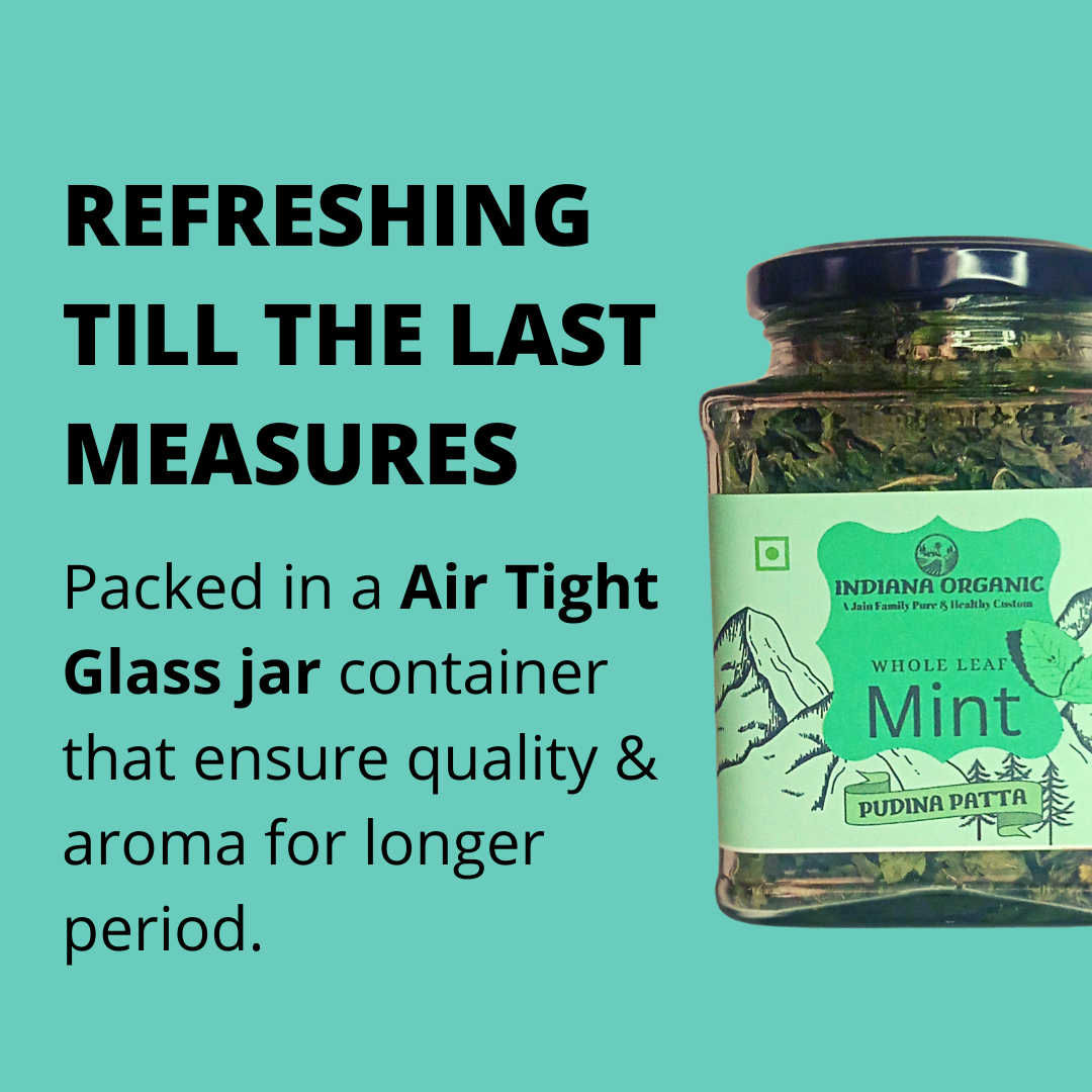 Indiana Organic Mint leaf pudina - Whole Leaf 25 Gram Glass Jar Packaging.