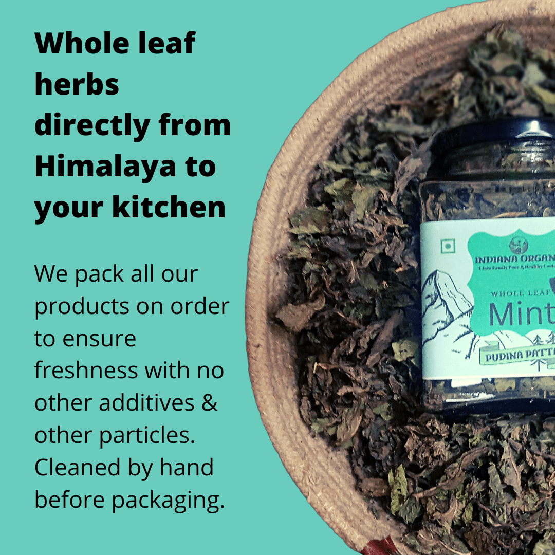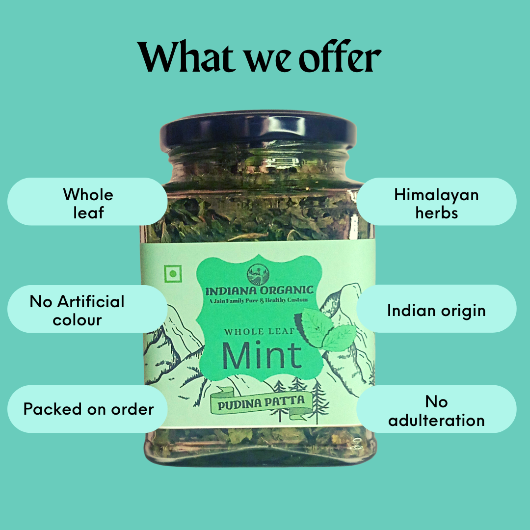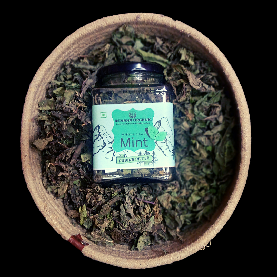Indiana Organic Mint leaf pudina - Whole Leaf 25 Gram Glass Jar Packaging.