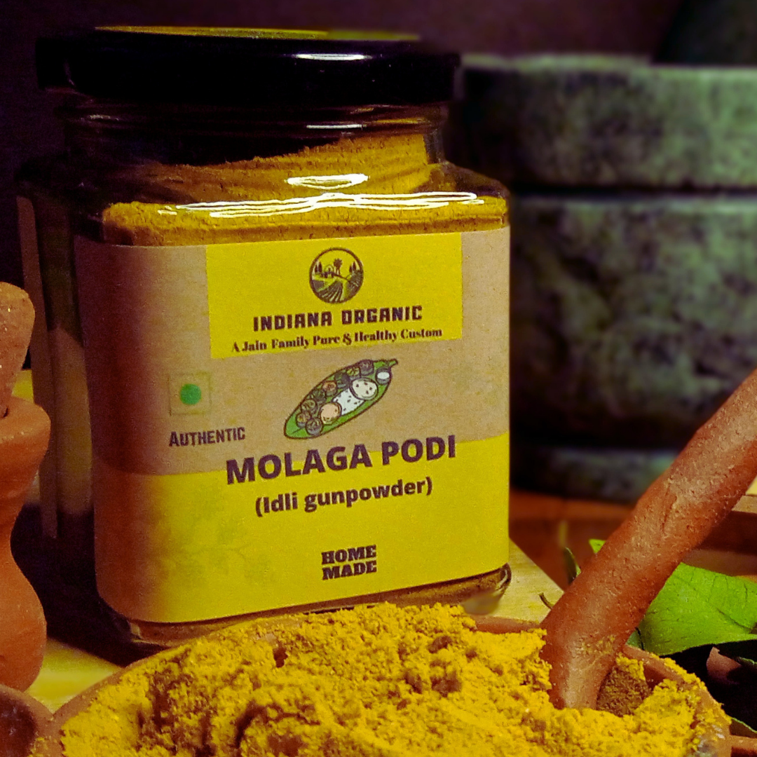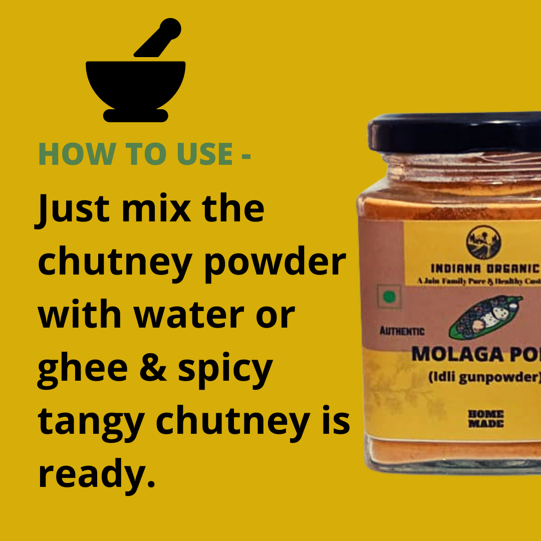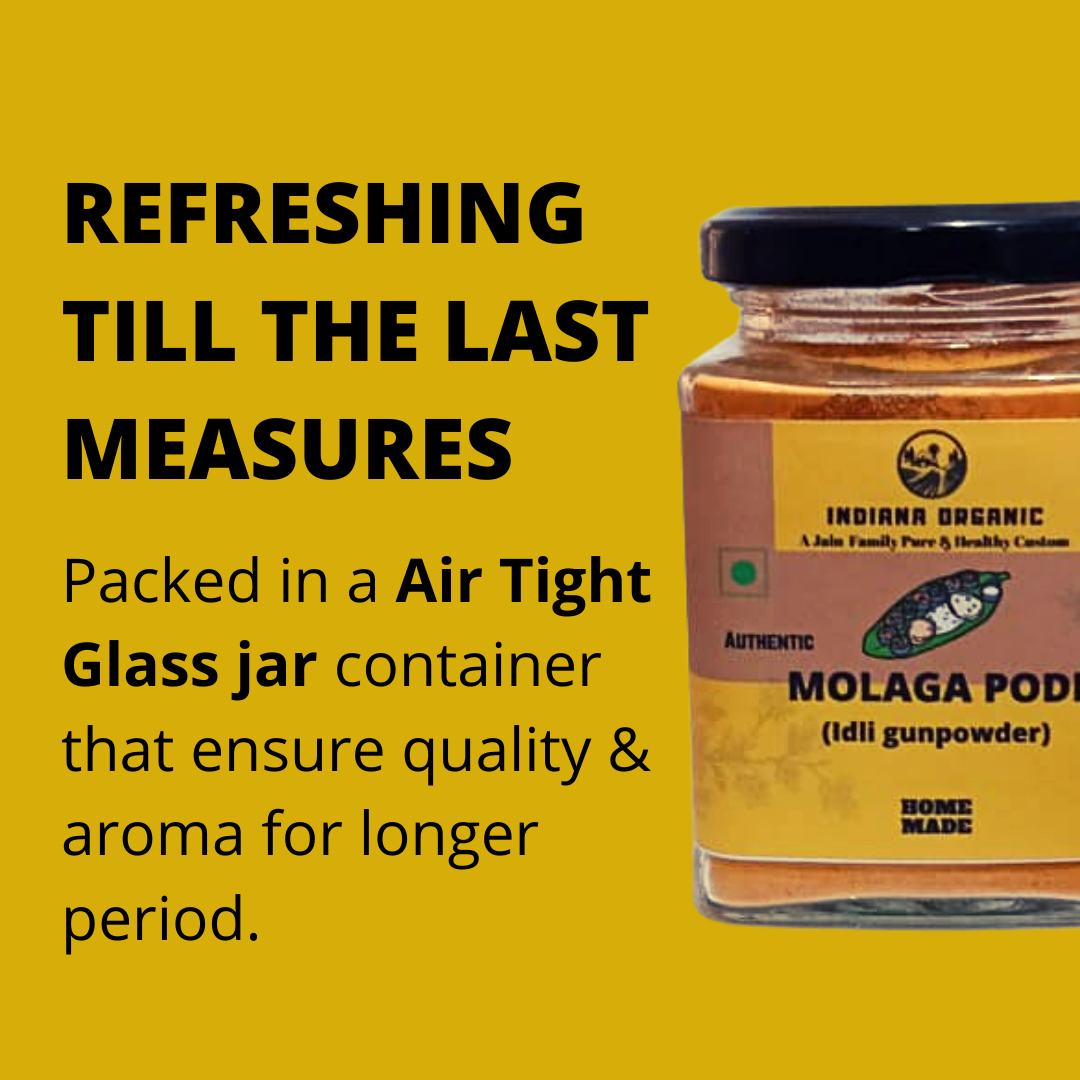 Molaga podi is typically served as a condiment with idli, dosa, and other South Indian dishes. It can also be mixed with ghee or oil and used as a dip for bread or as a seasoning for rice dishes. Molaga podi is known for its spicy, smoky flavor and is a favorite among spice lovers.