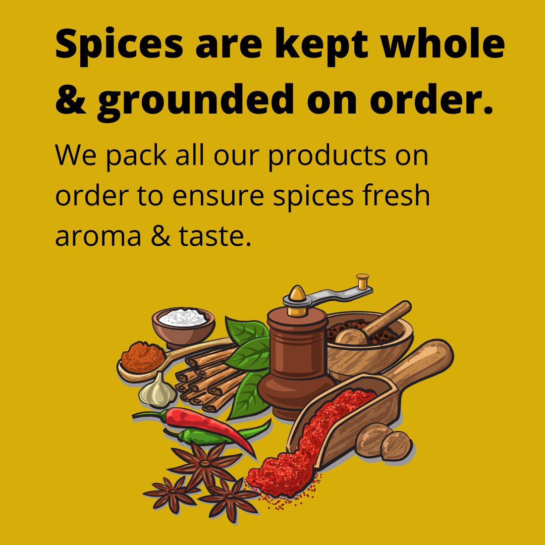 Spices get their intense flavor and aroma from volatile oils locked inside the whole spice. Grinding spices releases these oils, which means that many pre-ground spices-while convenient-have lost a lot of their magic before they reach your kitchen. The fresher the grind, the more potent the spice. We believe in providing freshly ground spices to our customers. Every product is packed after receiving order so that our customer can enjoy fresh aroma & flavor of spices & herbs. Each spice is carefully selected and curated from farms that practice environmental stewardship and empower their local communities.