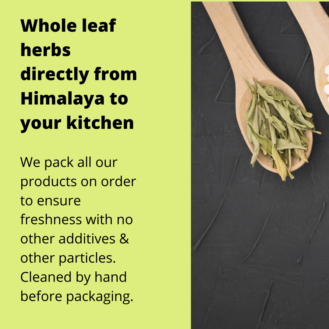 Introducing our premium whole leaf dry herbs, sourced directly from the Himalayas and handpicked from the recent harvest. Our herbs are carefully selected and packed on order to ensure maximum freshness and quality.